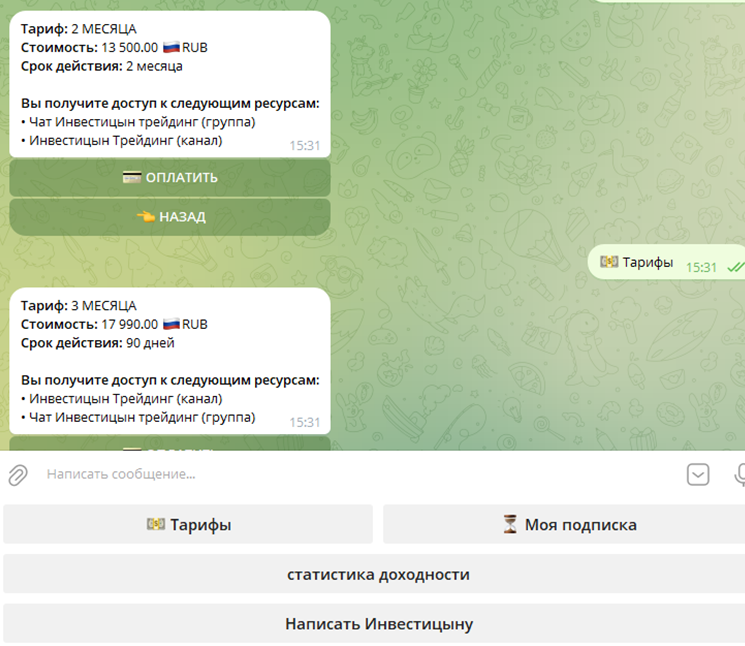 Однозначно рекомендовать оплачивать подписку на закрытый канал Инвестицына мы не можем. Эффективность его сигналов не доказана. Советуем понаблюдать за деятельностью трейдера в чате “Инвестицын новый”. Это поможет принять взвешенное и беспристрастное решение.