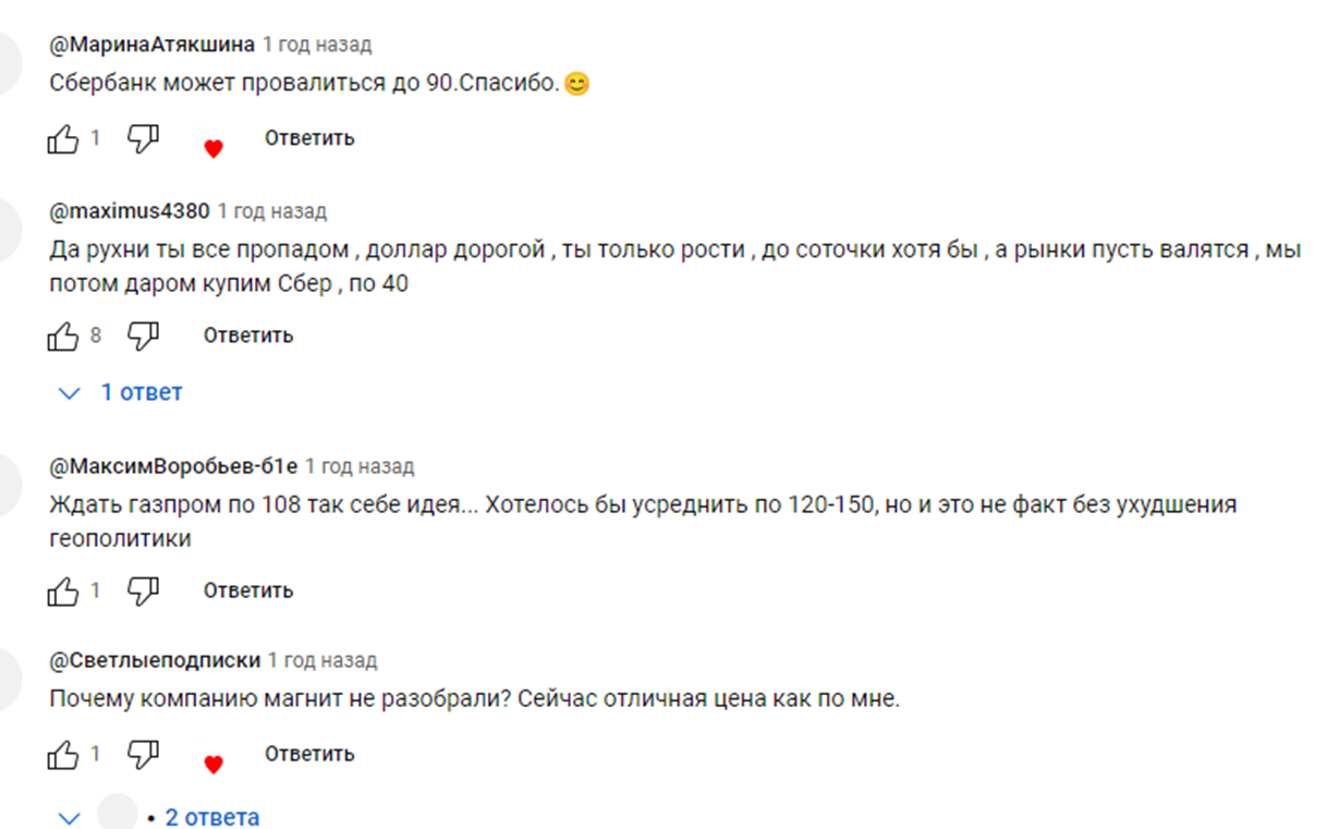 Под роликами на Ютубе отрицательных комментов нет. Подписчики обсуждают бумаги, обзоры которых делает Инвестицын.
