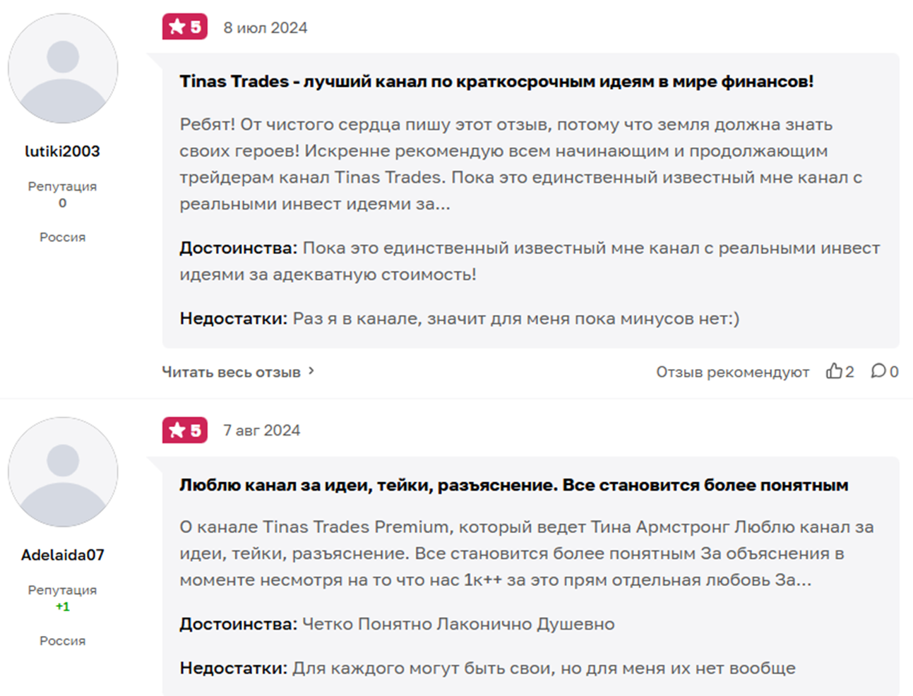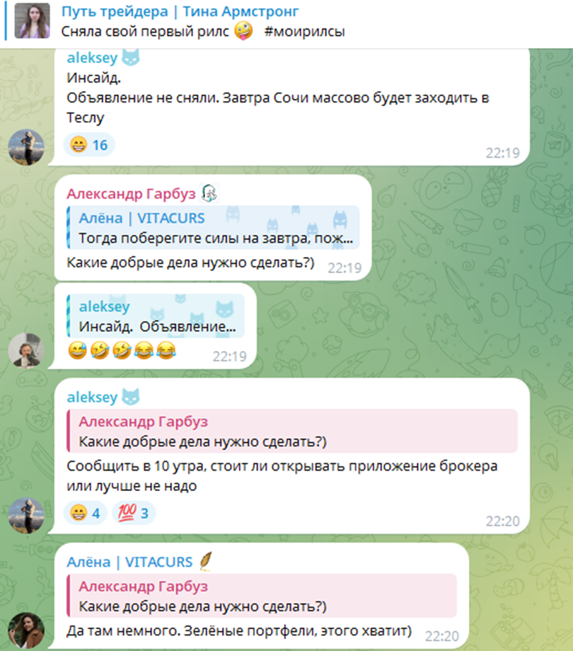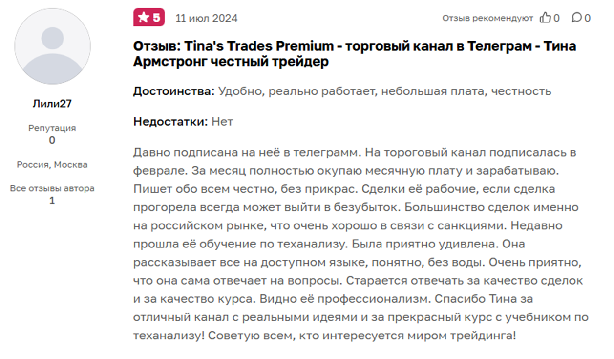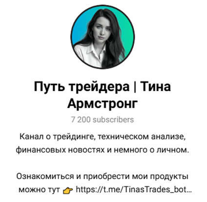 Мы можем рекомендовать трейдера Тину Армстронг – в ее канале немало полезной информации о торговле на российском фондовом рынке. Отзывы на сотрудничество положительные. Но перед покупкой курса рекомендуем внимательно ознакомиться с деятельностью девушки и уточнить в личной переписке с ней правила возврата средств и гарантии. Так как официальных документов Тина не предоставляет.
