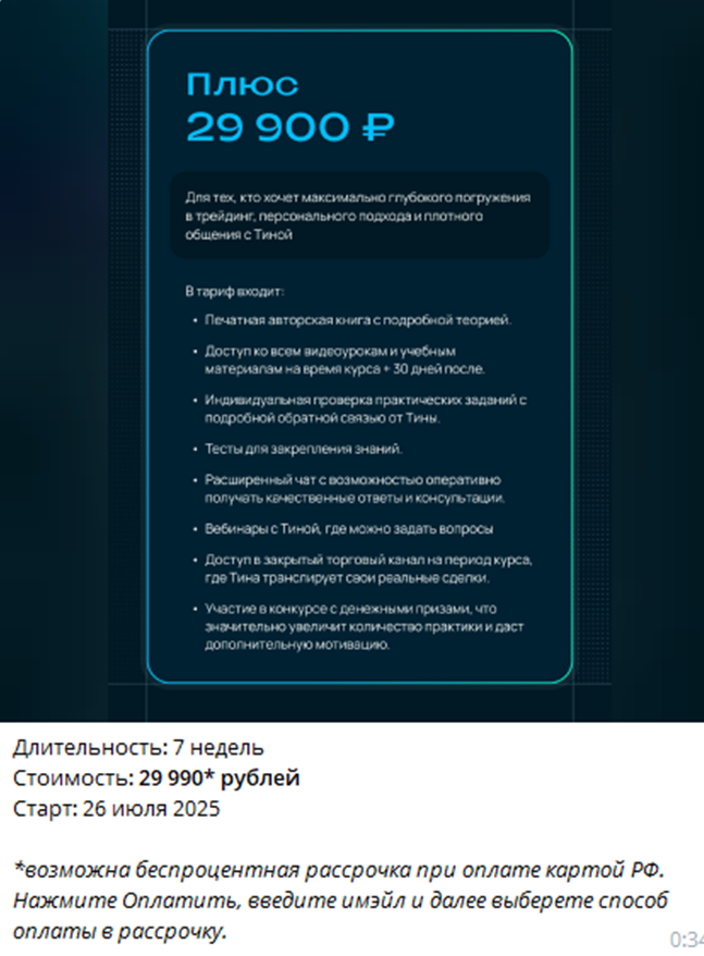На курсе два тарифа – Лайт и Плюс за 17 900 рублей и 29 900 рублей, соответственно. В первый тариф включены видео уроки, книга, вебинары, доступ в сообщество единомышленников. Во второй – индивидуальная проверка домашних заданий, возможность задать Тине вопросы, доступ в чат со сделками Тины в режиме реального времени.