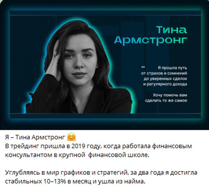 Трейдер Тина Армстронг отзывы на свою работу имеет положительные. Пользователи утверждают, что перед нами честный трейдер. Девушка ведет канал в Телеграме, где рассказывает о трейдинге на фондовом рынке и периодически набирает учеников на свои курсы. Правдивы ли отзывы и насколько профессиональным трейдером является Тина, расскажем в обзоре.