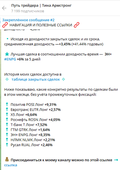 К слову, статистика каждый месяц публикуется в закрытой группе, а затем выкладывается в общий канал. Причем Тина честно сообщает и о прибыльных и об убыточных сделках.