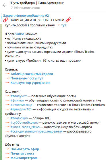 Канал Тины Армстронг о трейдинге. На фото ниже вы можете наблюдать разделение публикаций по темам.