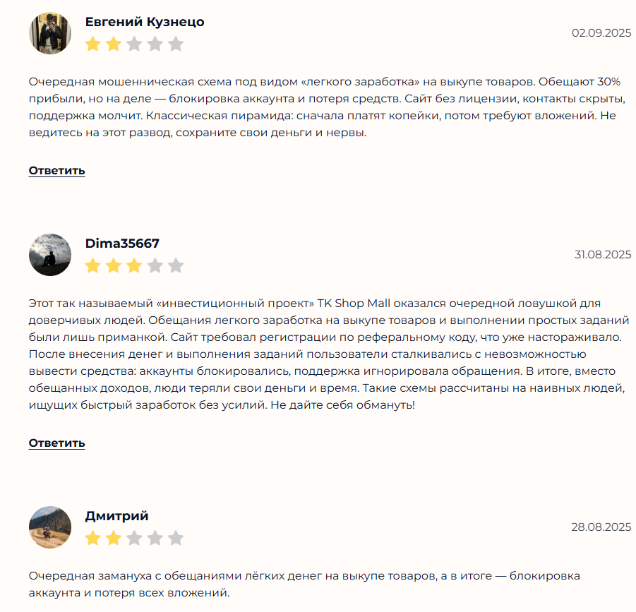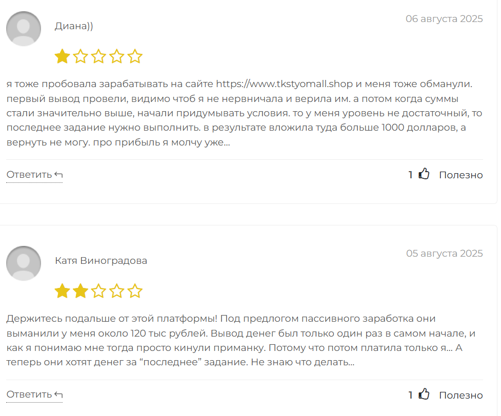 В интернете имеются негативные отзывы о платформе Tkstyomall. Люди теряют значительные суммы денег. Трейдеров заманивают обещаниями легкого заработка, но в итоге выманивают средства. Один из пользователей рассказал историю своей подруги, которая также попалась на уловки проекта.