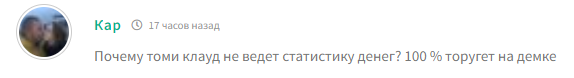 В интернете про этого инвестора Tomycloud ходят лишь негативные отзывы. В частности люди жалуются на то, что сделки автора не имеют такой высокой проходимости. Все те, кто пытались следовать за идеями инвестора, оказывались в убытке.