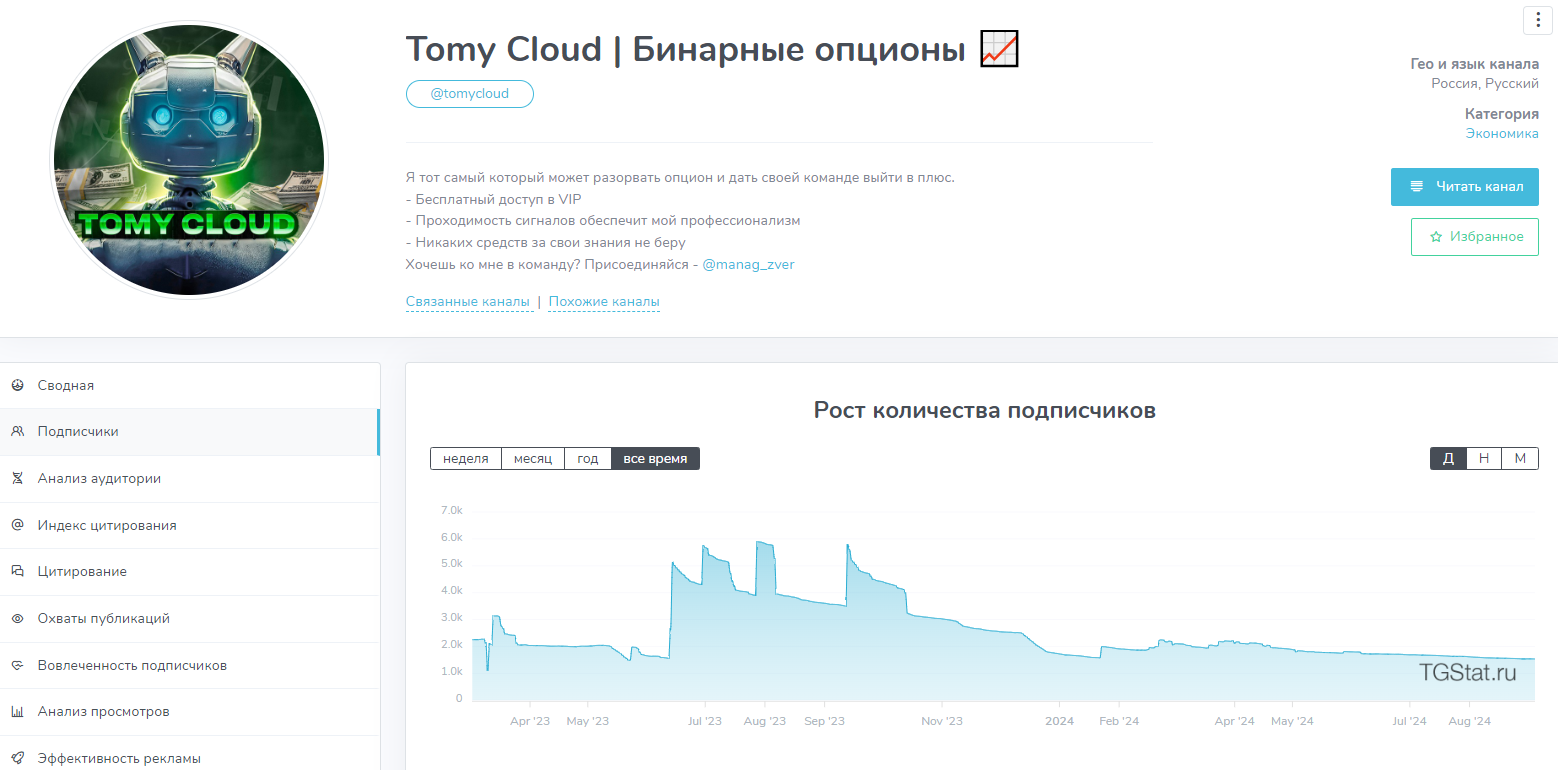 его ТГК с 1.5 сабов по любому накрученный, так как у него уж до жути какие то странные скачки подписчиков, после которых следует резкий спад. Бинарные опционы сами по себе минное поле, где царит обман. А когда их продвигает человек без лицензии, с фальшивой статистикой и накрученной аудиторией это уже не трейдинг, а лотерея с гарантированным проигрышем.