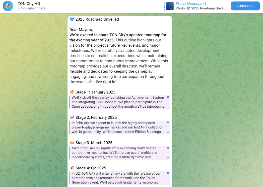 На новостной канал игры подписано около 8500 человек на 20.12.2024 года. В этом сообществе разработчики публикуют бесплатную информацию о том, что происходит в Ton City, какие нововведения вводятся. Здесь же можно увидеть дорожную карту проекта на 2025 год. Информация подается на английском языке.