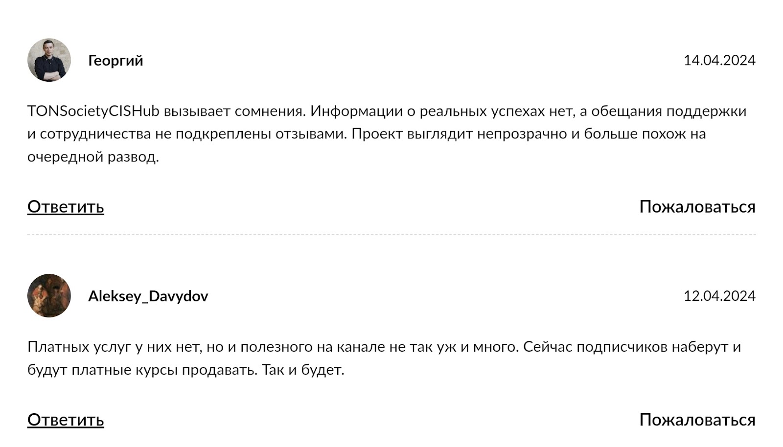 Но и часто попадаются отзывы на TonSocietyCisHub о том, что явной пользы от каналов тоже нет, а данные не всегда актуальны и достоверны, что не назовешь позитивным фидбеком.