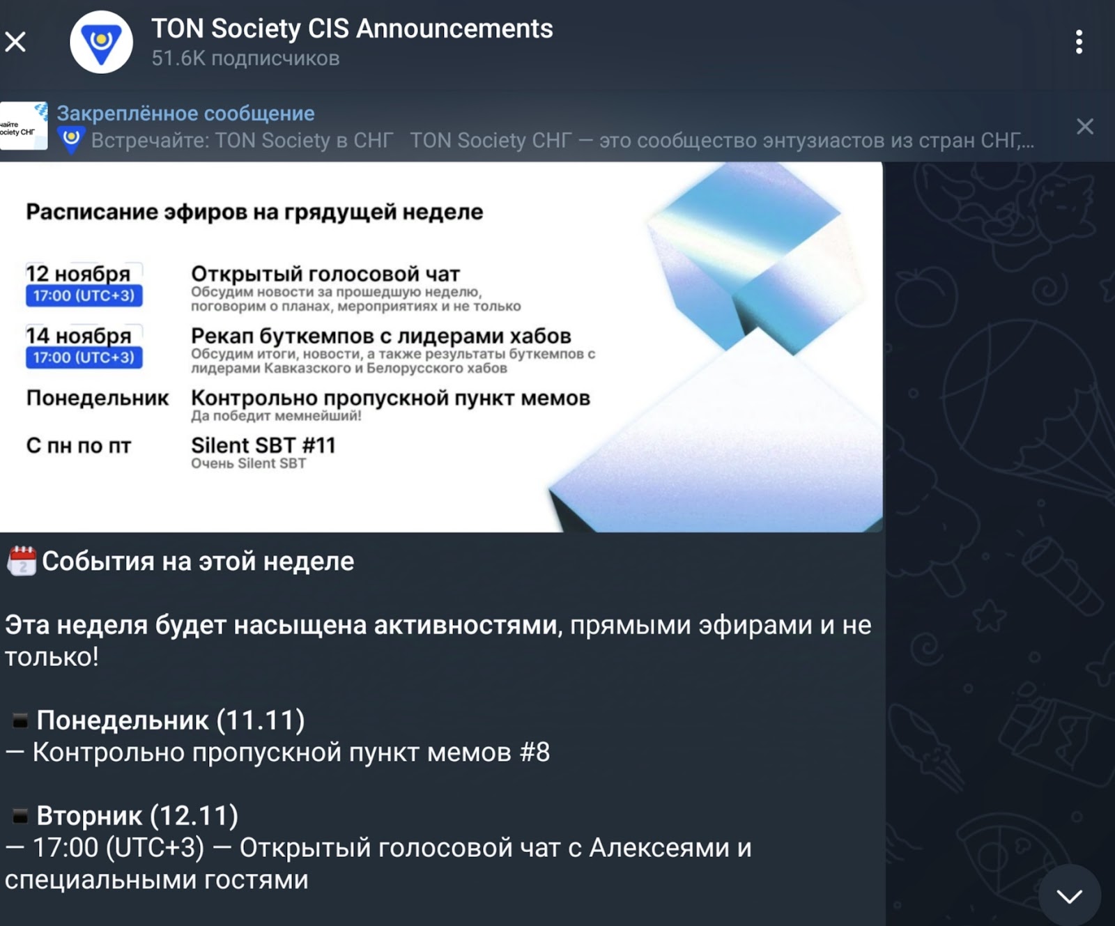 На Ton Society Cis Announcements выходят анонсы и итоги TON Breakfast — досуге команды со свободным входом, где проходят встречи, мероприятия, обсуждения TON, блокчейна. Еще на канале публикуются приглашения на митапы, новости из мира экосистемы, еженедельные дайджесты, интервью и многое другое.