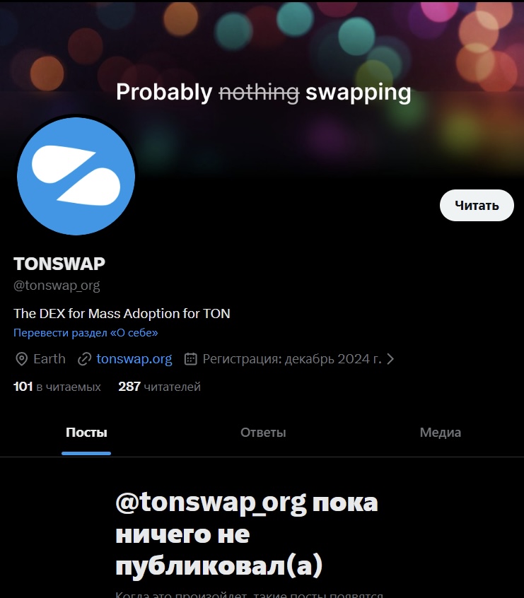 Twitter традиционно считается главной площадкой для глобального крипто-сообщества, где решаются вопросы листинга на крупные биржи и объявляются стратегические партнерства. Аккаунт Tonswap здесь выглядит заброшенным,