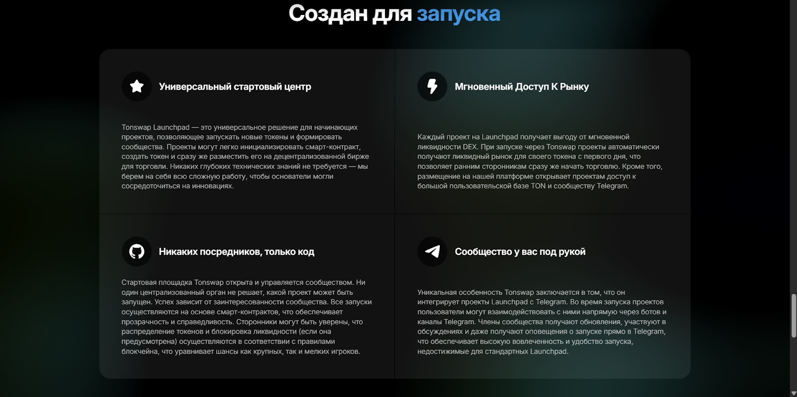Площадка активно занимается поддержкой первичного размещения токенов. Любой разработчик может выпустить свой токен в сети TON и добавить его на платформе, создав пул ликвидности.