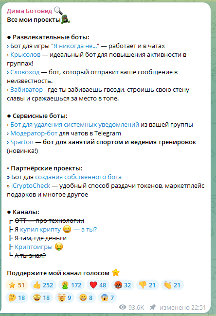 Дима Ботовед размещает информацию о своих ботах и проектах, якобы делая это на бесплатной основе. Боты классифицированы как: