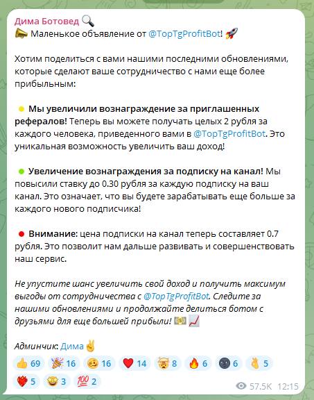 Автор канала также позиционирует себя как трейдера и криптоэнтузиаста. В экосистему Дима Ботовед входят бесплатные боты и партнерские проекты. В них есть возможность создать собственного бота или интегрировать маркетинговые механики через Telegram.