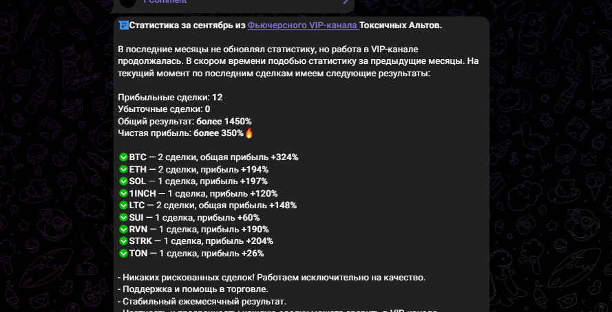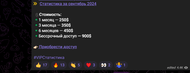 Кроме того, на канале периодически публикуются предложения платных услуг, таких как доступ в VIP-канал и подписка на индикатор TA Signals. Стоимость таких предложений варьируется от $250 за месячный доступ к VIP до $900 за бессрочный. Является ли такая цена оправданной — не ясно, ведь эффективность этих продуктов ничем не доказана.