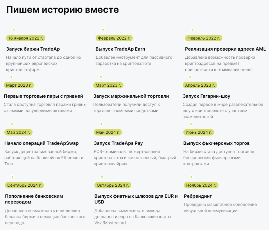 Биржу Tradeap основали в 2022 году. В начале года разработчики добавили возможность пассивно зарабатывать на цифровой валюте. В течение следующих 2 лет площадку дополняли новыми функциями. В 2024 году заработала децентрализованная платформа. Осенью добавили возможность пополнять баланс и выводить деньги посредством банковских карточек.