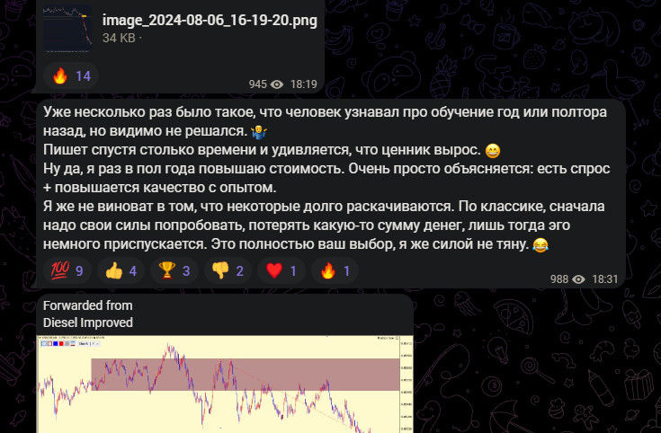 Что входит в учебную программу не разглашается, так же как длительность и цена на услуги. Блогер предпочитает обговаривать детали в личной переписке через бот @tradefaqbot.