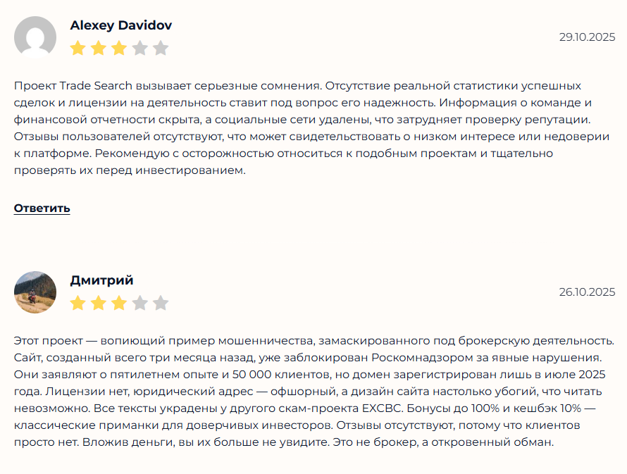 Другой деятель обвиняет платформу в обмане. Автор называет Trade Search аналогичным другим сомнительным сервисам и указывает на некачественный дизайн сайта, отсутствие лицензий и невозможность вывода средств. Обещания платформы не соответствуют реальности.
