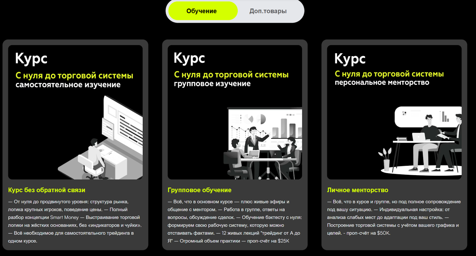В комплект входит проп-счет на $25000, который якобы предоставляется для реальной торговли. На деле счет оказывается демо-версией без возможности вывода средств, а менторы не предоставляют четкие ответы. Индивидуальное менторство предлагается за 376000 рублей и представляет собой расширенную версию группового обучения. Анализируются слабые стороны трейдера, подстраивается процесс под его стиль работы, график и цели. Строится персональная торговая система.