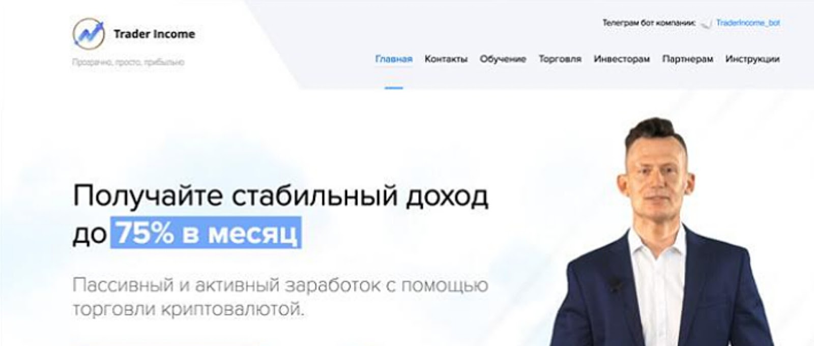 Trader Income — это проект, предлагающий получать до 75% прибыли за торговлю криптовалютами, а также за вложения в активы. Помимо этого, основатели предоставляют возможность получать заработок за реферальную систему, обещая быстрый вывод денег. Начать сотрудничество можно с депозитом в 30 долларов, и далее мы расскажем о компании подробнее.