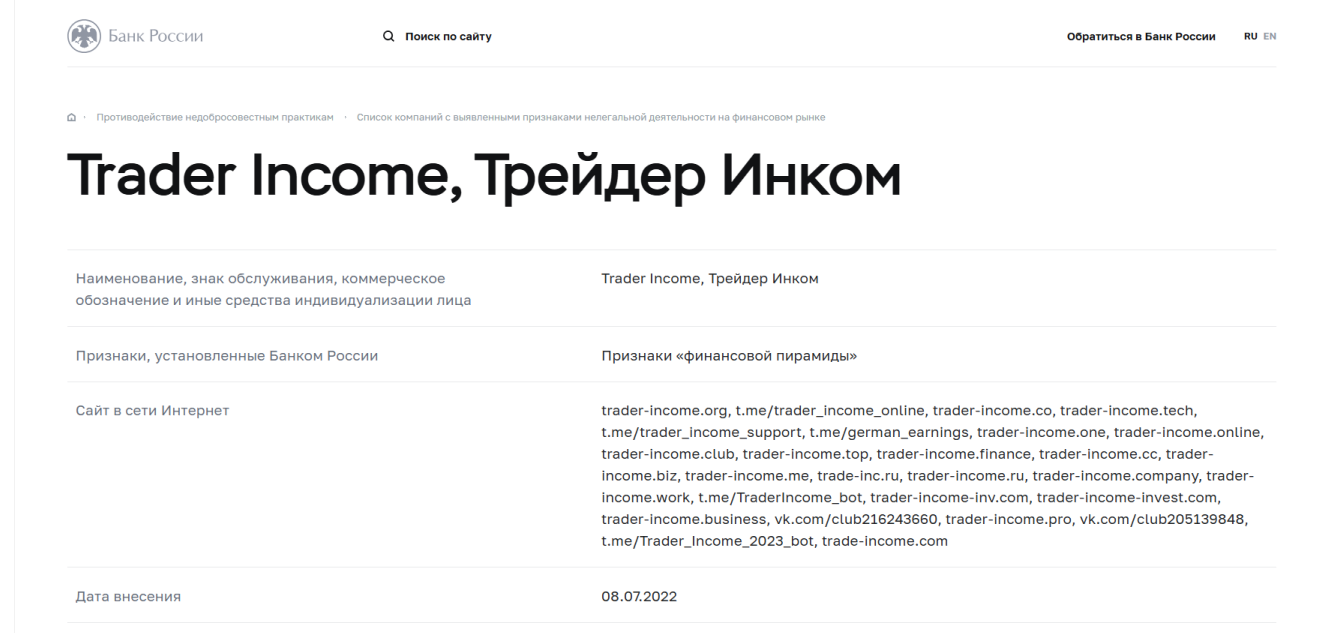Проект Трейдер Инкоме уже не работает, однако он занесен в черный список ЦБ РФ за признаки финансовой пирамиды. Основатели предоставляли необоснованные гарантии большого заработка, ведь не публиковали верифицированных отчетов по выплатам. В интернете есть жалобы бывших клиентов на потерю денег, и из негативных моментов о компании мы отметили: