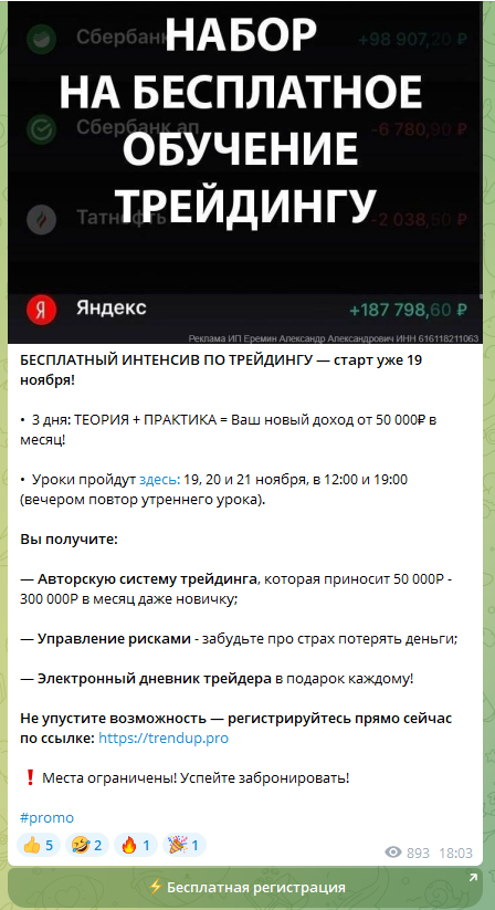 Детальные прогнозы и торговые сигналы на канале отсутствуют. Периодически администратор размещает партнерские ссылки для регистрации на различных ресурсах. Трейдер предлагает индивидуальное обучение:- курс по работе на Московской бирже;