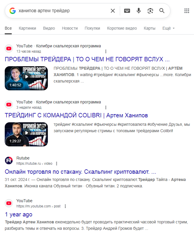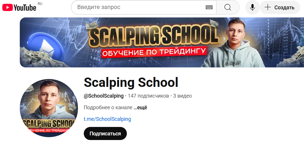 Зато в сети нам нашлись ссылки на другие соцсети Артема Ханипова @ trader hanipov, такие как ютуб и тикток. Выяснилось, что Артем является создателем школы скальпинга. Похоже, создана она была тоже около двух лет назад. Но ютуб-канал запущен всего полгода назад, а два единственных ролика здесь вышли всего месяц назад.