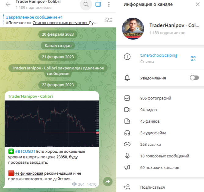 Телеграм-канал трейдера Ханипова Артема TraderHanipov Colibri был создан в феврале 2023 года. С самого начала админ начал выкладывать экспертный контент. Никакого приветственного сообщения он публиковать не стал.