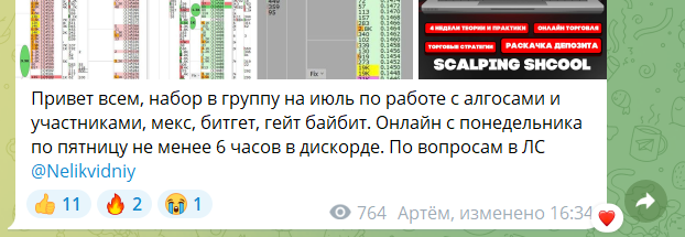 Как такового прайса с платными услугами в блоге @ SchoolScalping нет. Но в одной из публикации мы прочитали, что трейдер Ханипов Артем ведет набор учеников по группам. По всем вопросам автор предлагает писать ему в личку @ Nekilvid. Чего-то конкретного он не стал обещать, плюс, стоимость сотрудничества не афишируется.