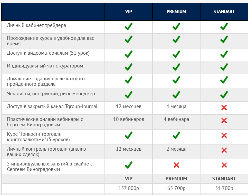 Обучение от Трейдерсгруп на фоне 2-х дневного марафона выглядит еще более странно. Здесь стоимость гораздо выше: всего за 4 практических вебинара, видео и 2 месяца контроля запрашивают, например, уже более 65 тыс. рублей. А по тарифу “Standard”, в который вообще включены только заранее записанные заранее материалы, придется заплатить около 51 тыс. рублей. Подписка “VIP”, конечно, предлагает намного больше, но стоит уже 157 тыс. рублей. При этом насчет эффективности курса по описанию на сайте мало что понятно.