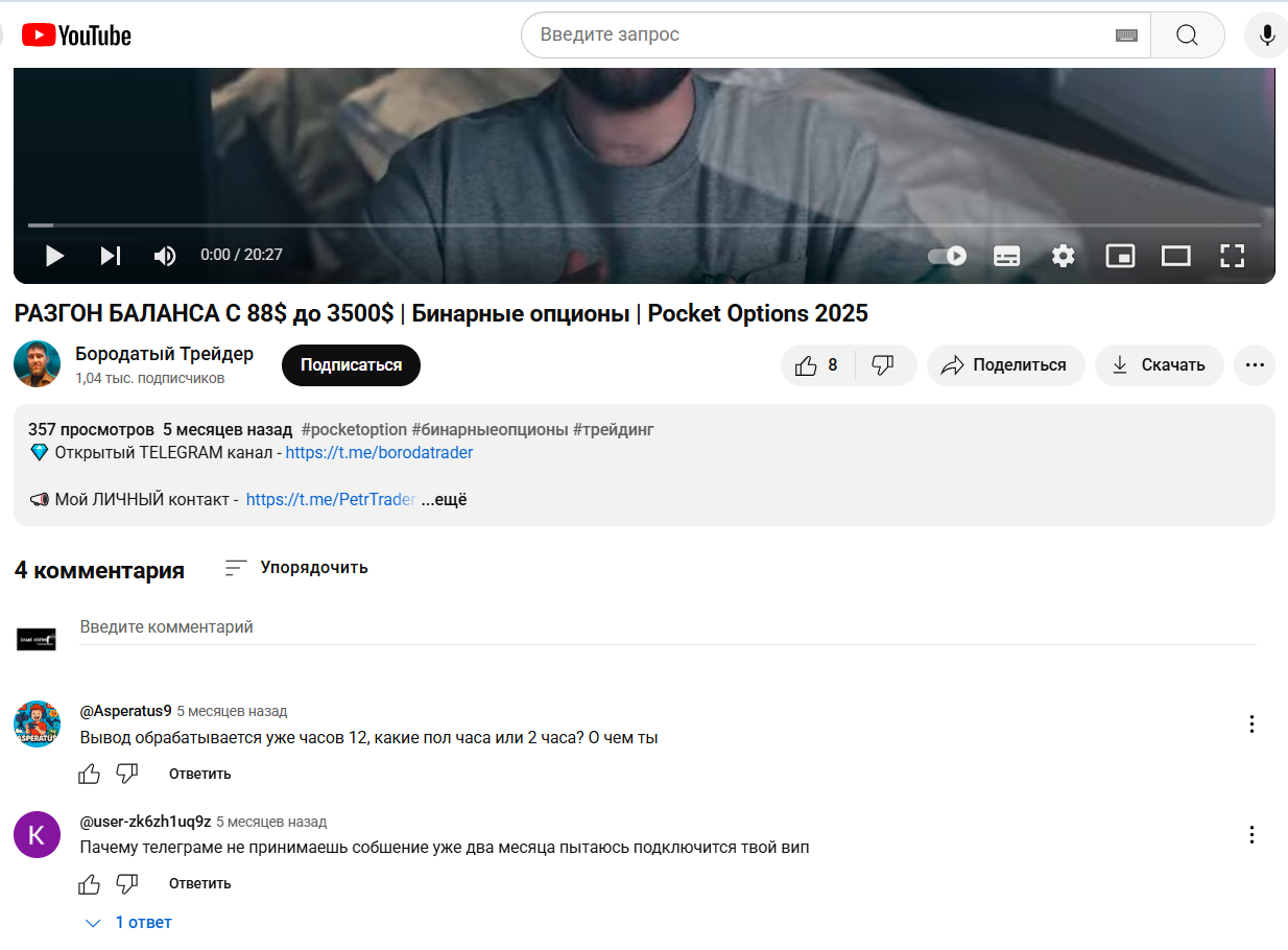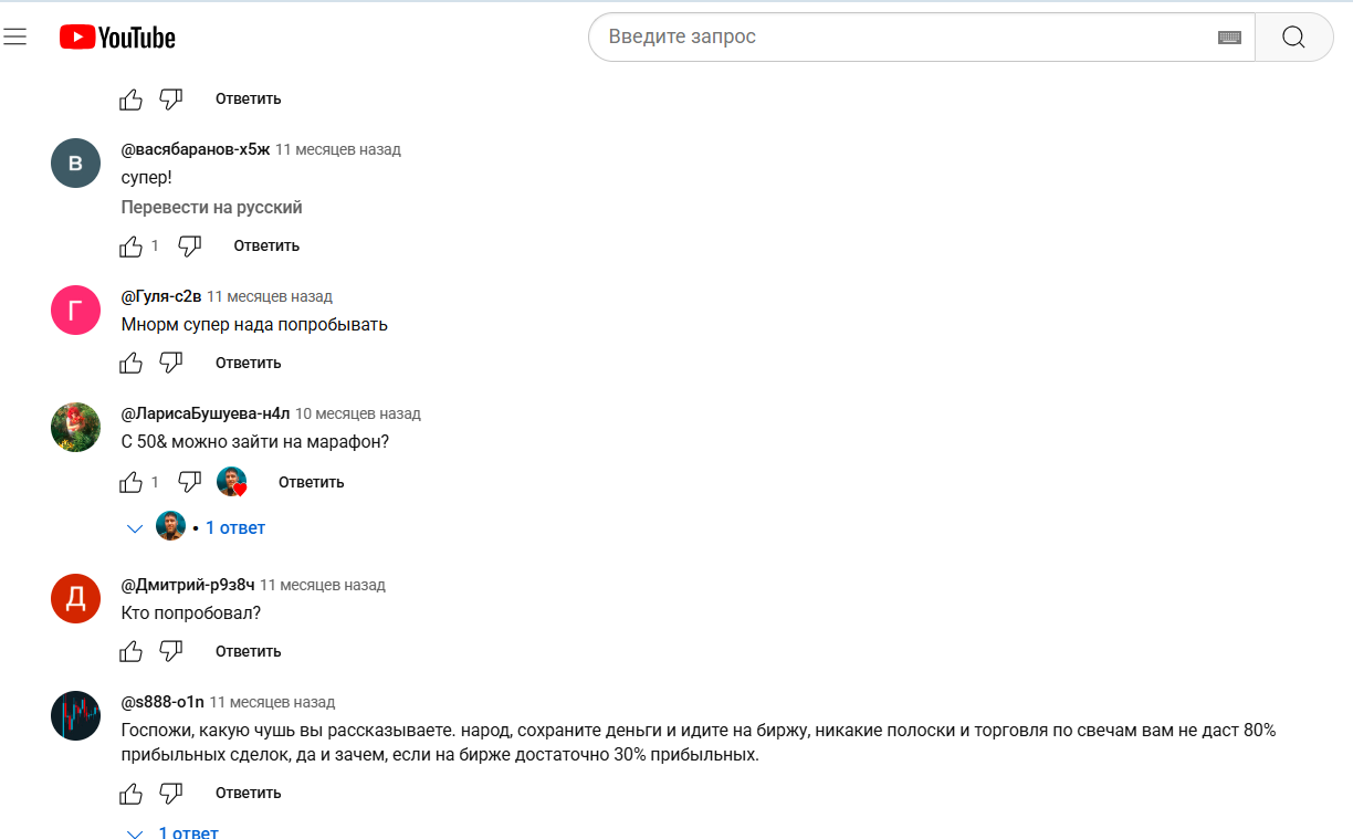 На популярных мониторинговых платформах, трейдерских форумах и в крипто сообществах отзывов о Бородатом Трейдере или его торговле также нет. Единственное место, где можно услышать хоть какие-то отклики от реальных зрителей — это его YouTube-канал @tradeboroda.