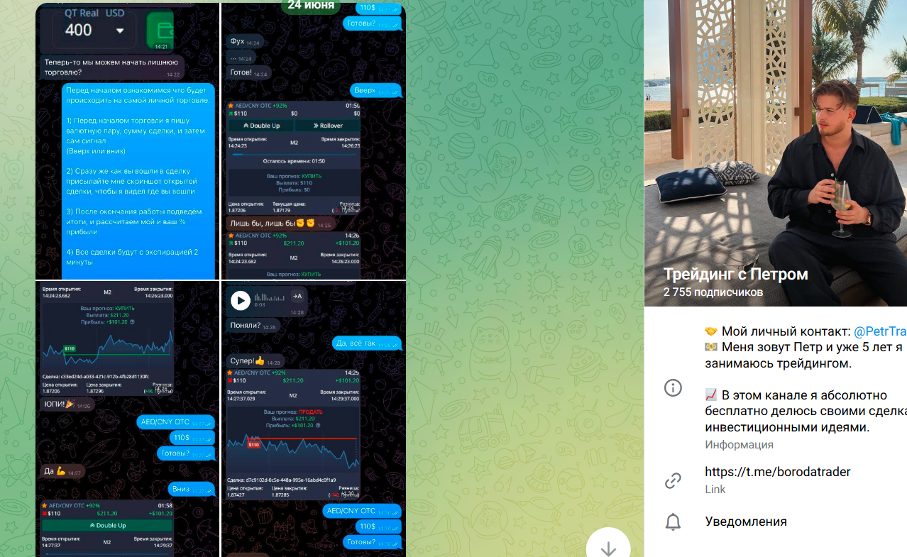 Суть схемы следующая: подписчик вносит депозит от $400, Петр присылает ему сигналы напрямую в ТГ, а по итогам делится прибылью — 20% от дохода остается у Петра как вознаграждение.