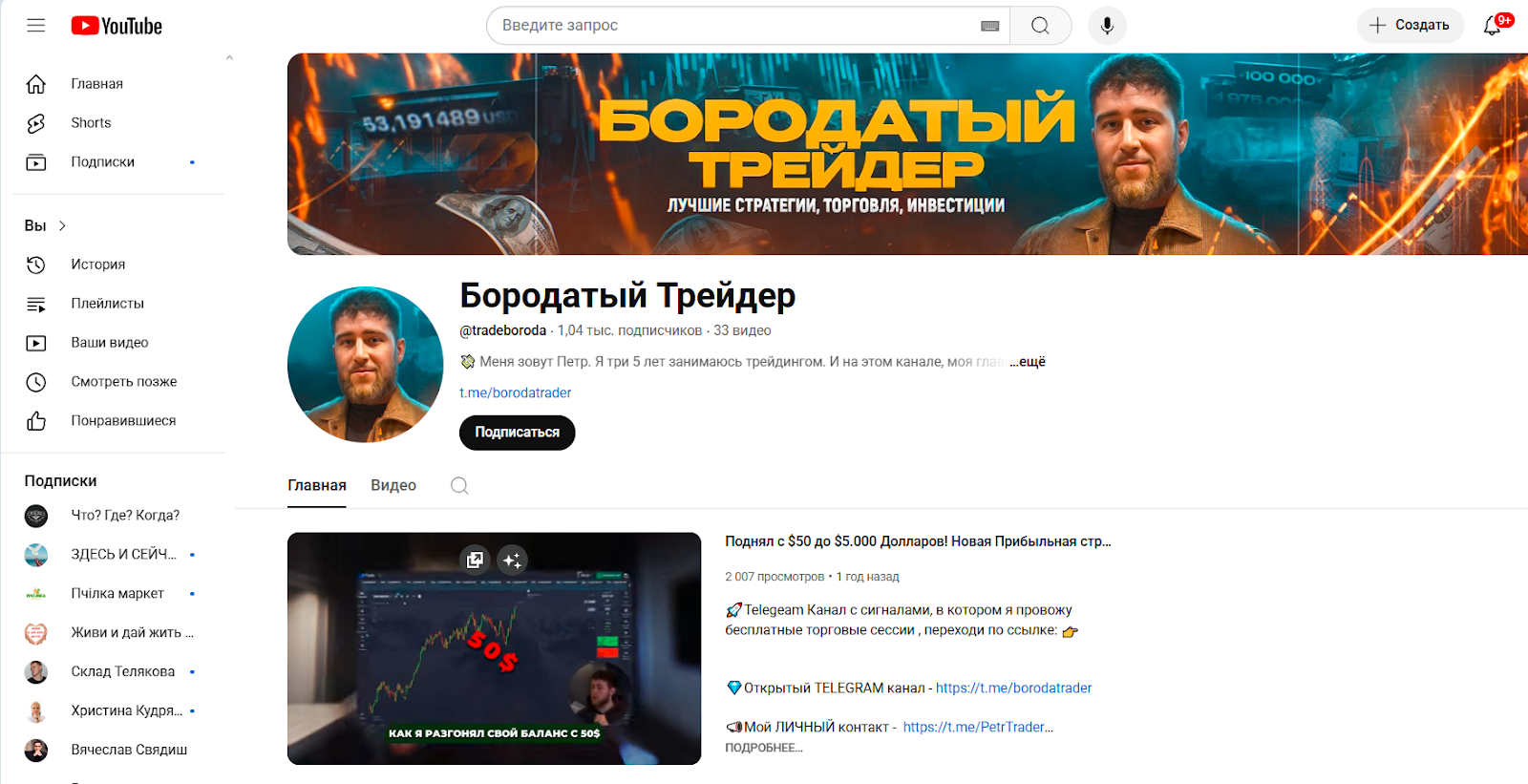 Вторая платформа это YouTube-канал @tradeboroda, где на данный момент 1К подписчиков, размещено 33 видео, суммарно собравших более 50К просмотров.