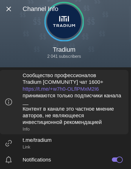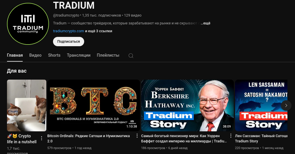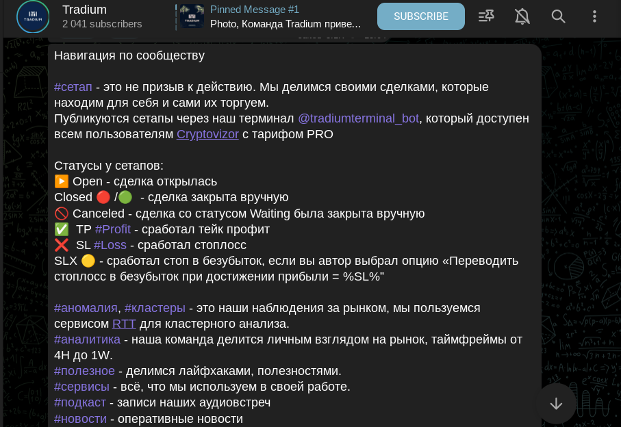 Tradium — финансовый телеграм-канал, который заточен под инвестиционную деятельность. Помимо вложений с нацелом на капитализацию, якобы профессиональный трейдер Tradium COMMUNITY рассматривает краткосрочную торговлю на бирже. Речь в информационном паблике tradiumcrypto идет о скальпинге и арбитраже. Опытный аналитик рассказывает, что и когда покупать, чтобы выйти на стабильный плюс к прибыли. Также создатель проекта по инвестициям говорит, в какой период лучше продать актив для усреднения дохода.