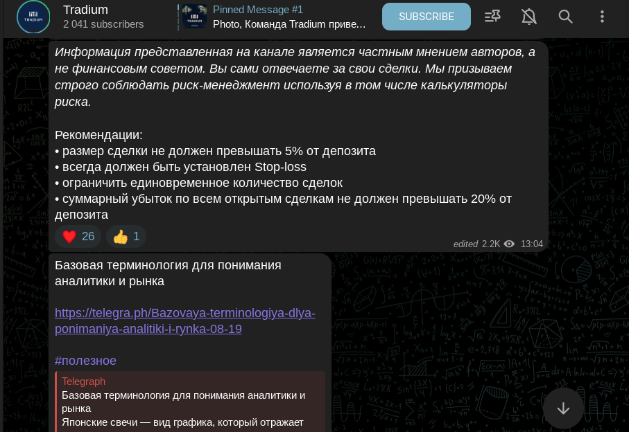 Описание канала Tradium стандартное. В нем автор проекта указывает, что канал — сообщество профессионалов. Далее создатель старается снять с себя ответственность. Он пишет, что информация — частное мнение команды, и она не является инвестиционной рекомендацией. Приписка распространенная, однако, посыл в контенте такой, чтобы пользователи следовали советам автора финансового канала.