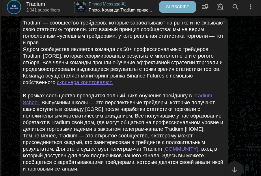 Автор говорит об открытости сделок, в этом аспекте он лукавит. Ведь в паблике нет ссылок на верифицированную статистику успешных сделок. Владелец «Традиум» пишет про использование скриннера криптовалют, а для обучения новых клиентов есть авторская школа.