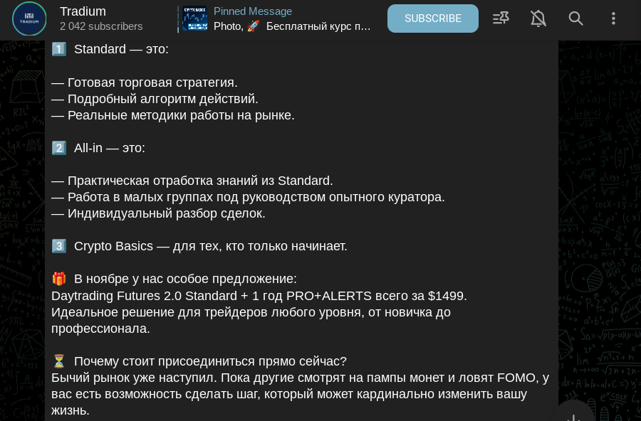 Также админ сообщил про старт особого предложения — Daytrading Futures 2.0 Standard + 1 год PRO+ALERTS всего за $1499. Помимо курсов и скринера у Tradium есть торговый терминал, в котором команда проекта публикует сетапы. Но он доступен только по подписке на PRO+ALERTS.