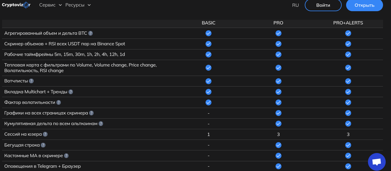 - Есть бесплатная базовая подписка. В нее входит агрегированный объем и дельта по биткоину. Скринер объемов + RSI всех USDT пар на Binance Spot, Рабочие таймфреймы 5m, 15m, 30m, 1h, 2h, 4h, 12h, 1d. Тепловая карта с фильтрами по Volume от Tradium. Volume change. Price change. Волатильность. RSI change. Вотчлисты. Вкладка Multichart + Тренды. Фактор волатильности.