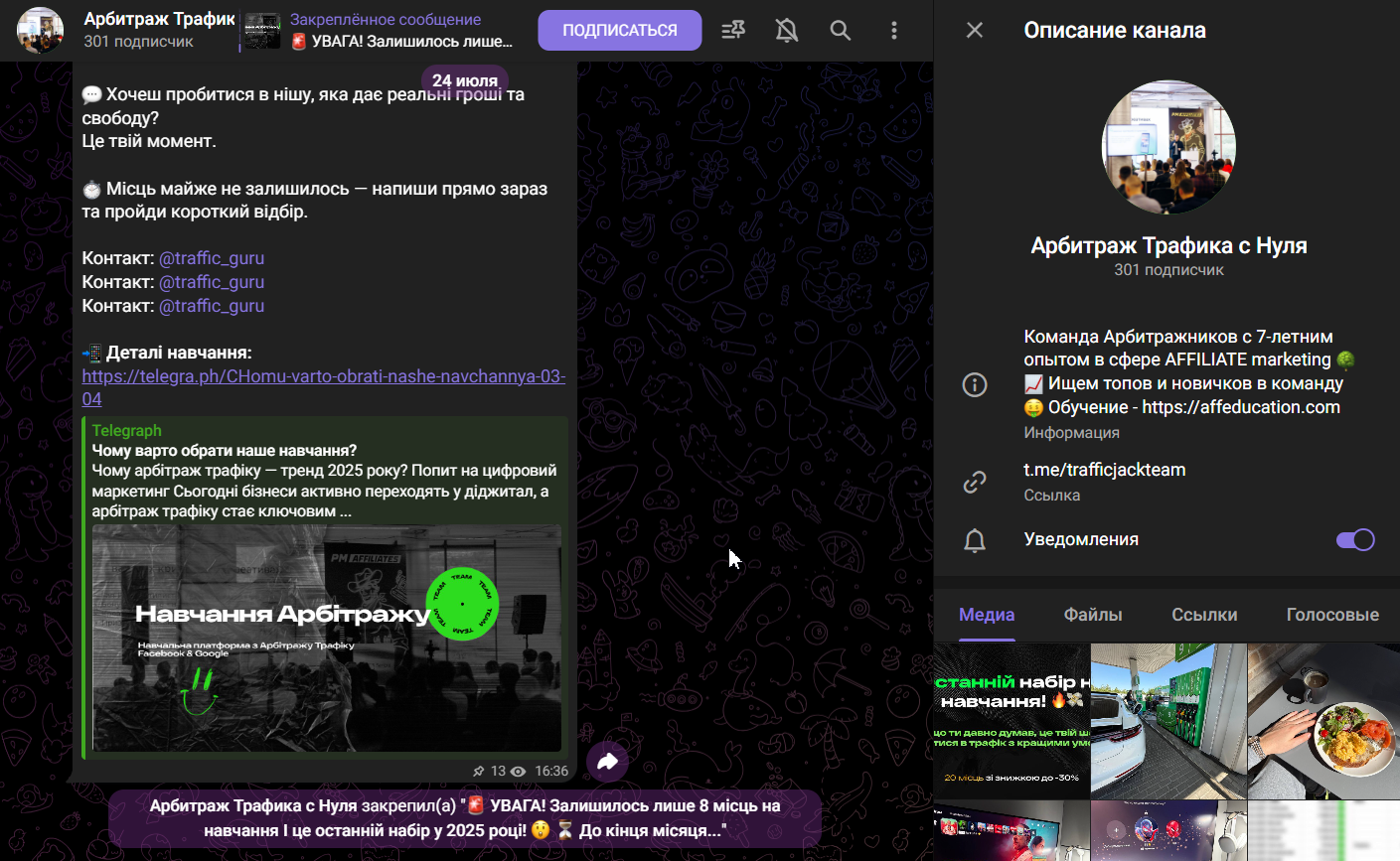 Traffic Jack зарегистрированы в Телеграмм под никнеймом TrafficJackTeam с ссылкой на профиль админа Traffic Guru. Канал был создан в 202 году. Здесь публикуют видео обращения от команды, анонсируют новые образовательные продукты, оставляют ссылки на ролики в Ютуб EdTraffic.