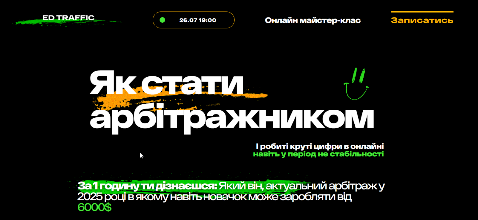 Как такового основного сайта у команды нет, есть только отдельные рекламные страницы конкретных курсов. Например, на TrafficJack site можно записаться на мастер-класс от Traffic Jack, который пройдёт 26.07 в 19:00. Всего за один час слушатели узнают, что такое арбитраж в 2025 году и как зарабатывать на нём от $6,000. Сразу после регистрации трейдер получит: