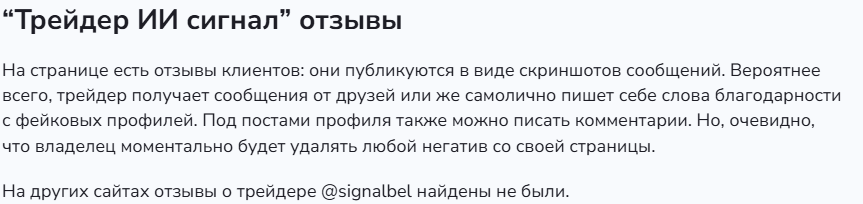 Сервис не стремится к созданию вовлечения. На странице @signalbel нет статистики, которая могла бы подтвердить успешность сигналов. Трейдер не предоставляет отчетов об их проходимости, графиков сделок или других доказательств компетентности. Утверждения об использовании ИИ не подкреплены доказательствами. Сертификатов или лицензий «опытный» трейдер также не предоставляет. Это делает его услуги подозрительными.