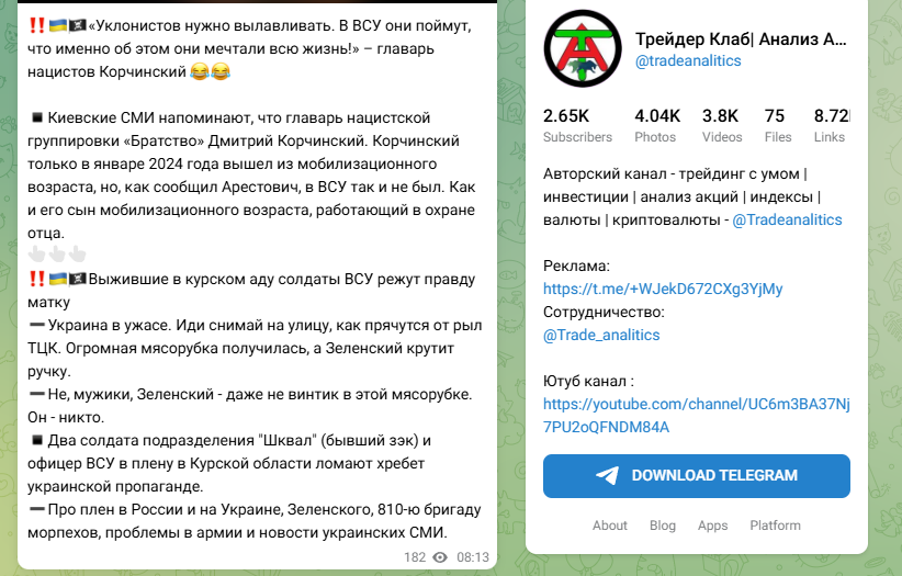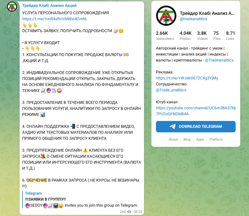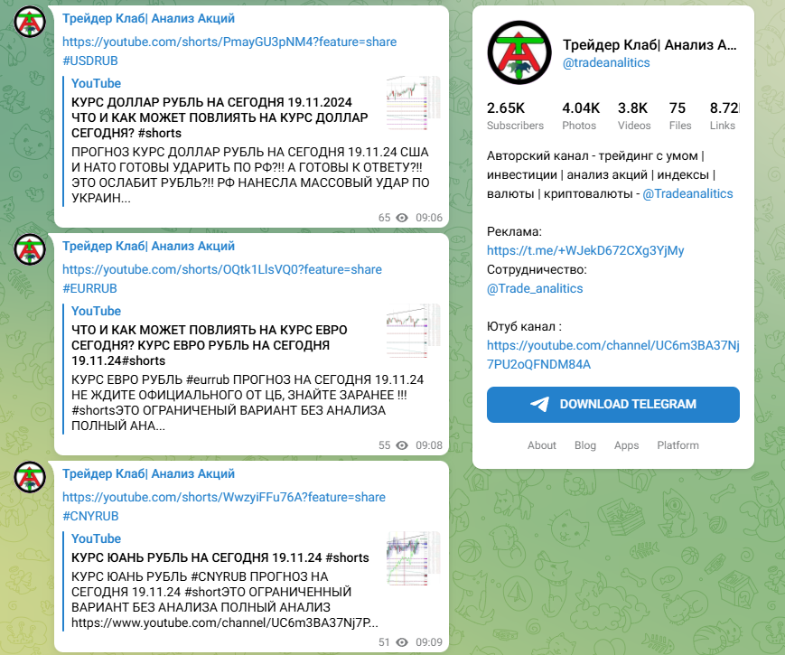 Телеграмм канал tradeanalitics существует более трех с половиной лет, его аудитория при этом всего 2655 человек. Посты читает около 20% подписчиков. Комментарии открыты, но вовлеченность ниже 0,8%. Контент состоит преимущественно из заимствованных из открытых источников новостей, комментариев автора и рекламы собственных услуг. Владелец канала анонимен, о себе не рассказывает. Помимо Телеграмм канала развивает Ютуб Трейдер Клаб, где аудитория составляет 6,3 тысячи подписчиков. В роликах TRADERCLUB автор разбирает акции, металлы, валюты, индексы и сырье. Обзоры выходят регулярно, отсортированы в плейлистах по каждому активу.