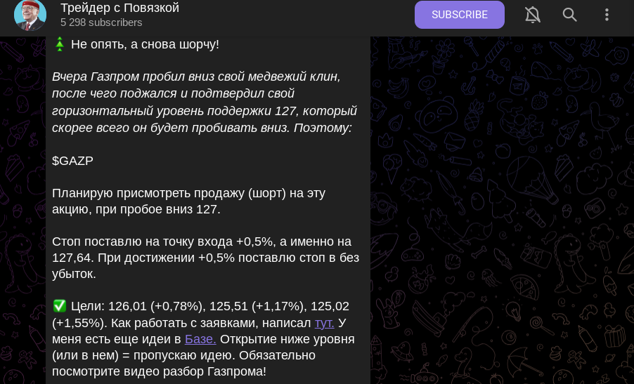 Платной информации на канале мы не нашли, как и предложения подписаться на закрытый вип-чат. Также непонятно, за счет чего происходит монетизация контента. Возможно, автор зарабатывает на просмотрах на канале Трейдер с повязкой.