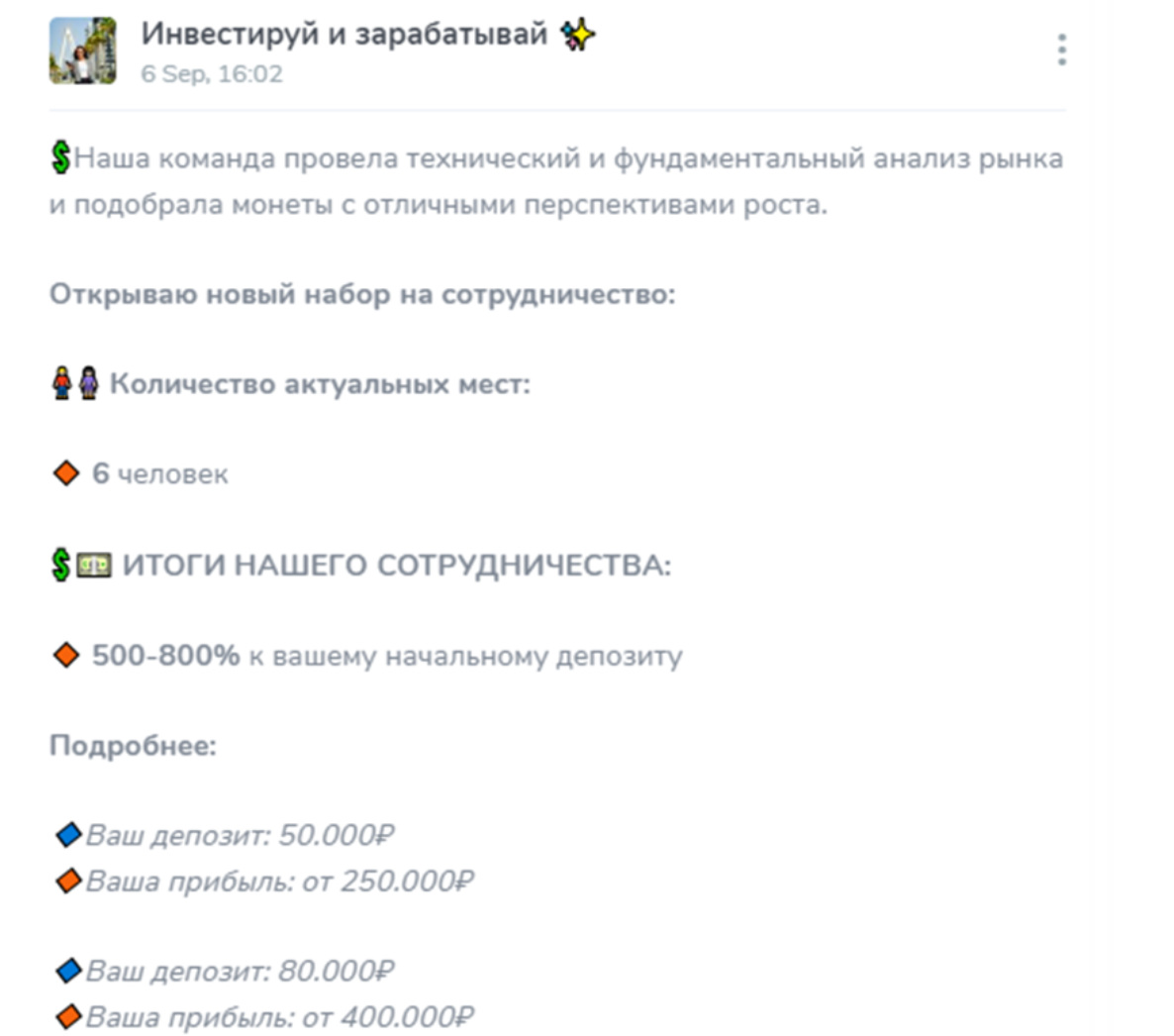 В своих публикациях Карина открывает наборы на участие в сотрудничестве. В них она постит количество свободных мест и итоги партнерства. Под итогами имеется в виду процент выгоды пользователя. Обычно он достигает 500-800% от начального депозита. Например, если начальный взнос клиента составлял 50 000 рублей, то его чистая прибыль может составить 250 000 ₽.