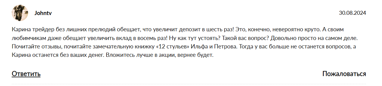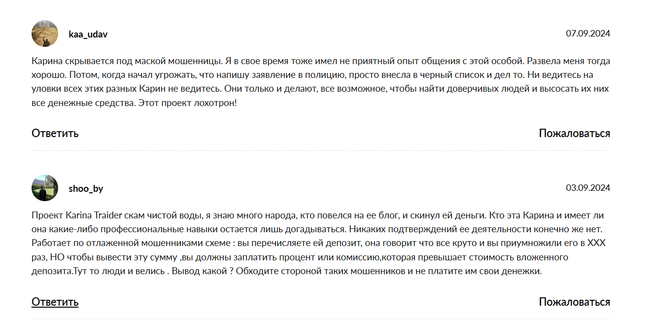Карина не публикует отзывы своих клиентов. Вероятно, это связано с тем, что проекты девушки фейковые, а схемы заработка являются мошенническими. В независимых интернет-источниках люди жалуются на то, что трейдер нагло разводит инвесторов на финансы.