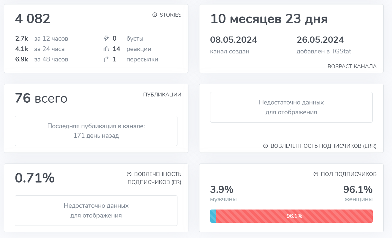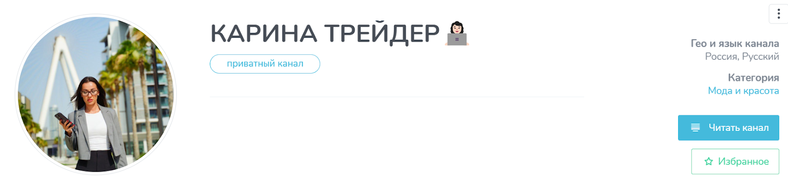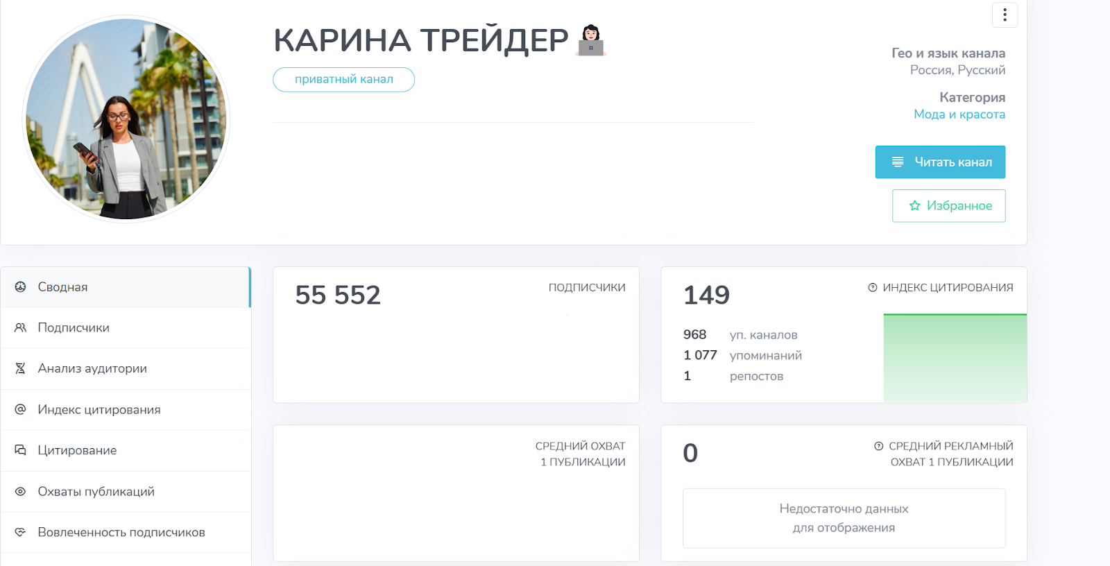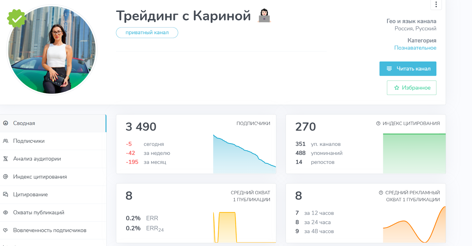 Первый канал называется «Карина Трейдер». Он насчитывает около 55 тысяч подписчиков. Известный паблик был создан меньше года назад. Несмотря на значительное число подписанных читателей, вовлеченность подписчиков составляет меньше 1%. Скорее всего, имела место быть накрутка.