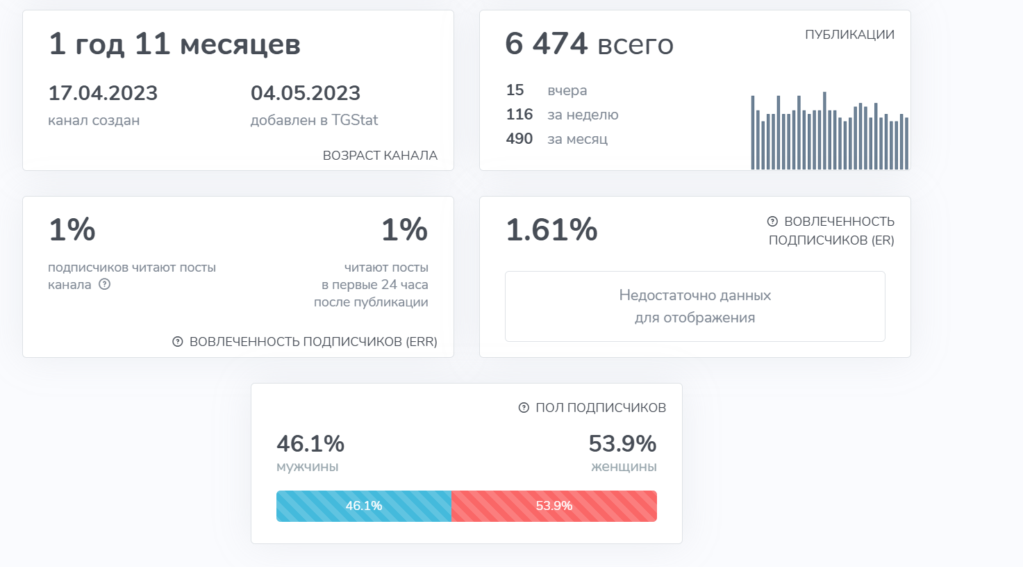 Сообщество «Трейдинг с Кариной» насчитывает чуть меньше 3500 подписчиков. Статистика демонстрирует, что от паблика с каждым месяцем отписывается все больше людей, но новых читателей не прибавляется. Группе практически 2 года, но она не смогла найти свою аудиторию. Всего 1% людей читают посты канала, вовлеченность также составляет 1% от числа подписанных.