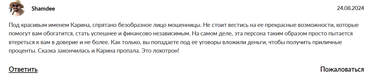 После отправки денег Карине она попросту игнорирует клиента. Бывали случаи, когда мошенница просила отправить дополнительную комиссию, о которой ранее не было оговорено. Перечислил или нет – Карина все равно заблокирует инвестора.