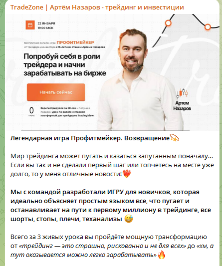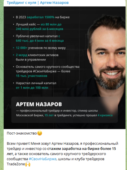 В телеграмм-блоге эксперта по трейдингу есть несколько закрепленных сообщений. В одном из них аналитик немного рассказывает о себе. Артем Назаров позиционирует себя как профессионального трейдера с опытом работы более 15 лет. Он выступает основателем школы TradeZone, в которой прошли обучение более 12 тыс. юзеров.
