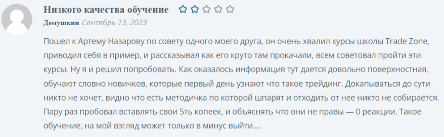 Мы не говорим, что Артем Назаров — мошенник, но качество его платных услуг оставляет желать лучшего. Если вы хотите освоить азы трейдинга и научиться зарабатывать, то описанный «эксперт» вам точно не подойдет. В работе специалиста были замечены «темные пятна», из-за которых мы и не рекомендуем с ним связываться:
