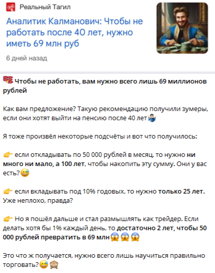 Есть еще один интересный закреп, в котором автор говорит о том, как за 2 года из 50 тыс. рублей сделать 69 млн. В посте специалист предлагает изучить мнение одного опытного аналитика. Тот сообщает, что люди, не желающие работать после 40 лет, могут спокойно жить, если за плечами есть эти самые 69 млн рублей.